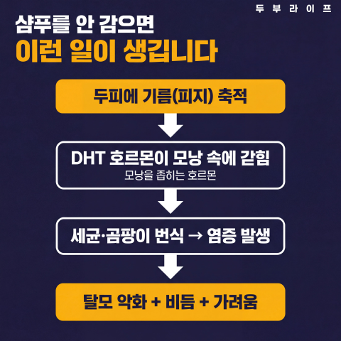 샴푸 안 함 → 기름 쌓임 → 세균 번식 → 염증 → 탈모 악화