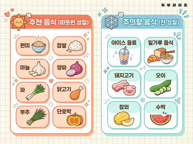 • 찬 음식: 아이스 음료·아이스크림·냉면, 체온 직접 저하