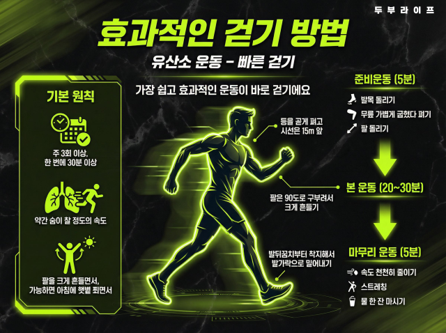 • 방법: 약간 숨이 찰 정도의 속도로 팔을 씩씩하게 흔들며 걷습니다.