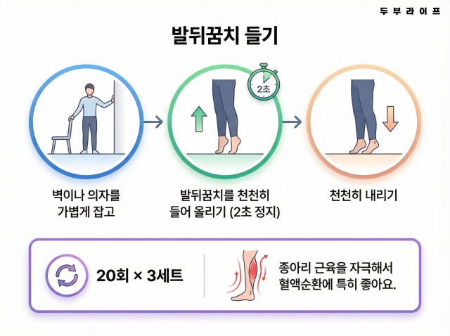 설거지를 하거나 양치할 때 뒤꿈치를 쭉 들었다가 천천히 내리세요.