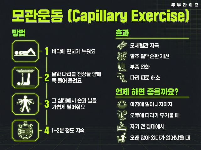 - 효과: 1~2분만 해도 말초 혈관이 자극되어 손발 저림과 부종이 좋아집니다.