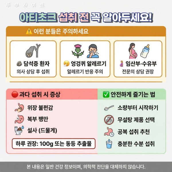 - 엉겅퀴 알레르기: 아티초크는 엉겅퀴과 식물이에요. 알레르기 반응에 주의하세요.