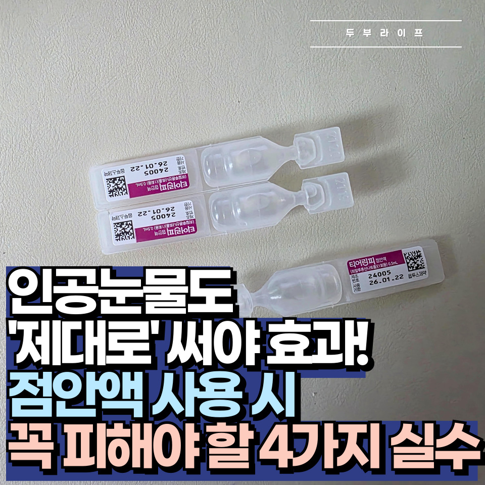 안녕하세요! 두부라이프입니다. "눈이 뻑뻑할 땐 인공눈물을 넣으면 되지!" 저도 예전엔 그렇게 생각했어요. 스마트폰, 컴퓨터 화면을 하루 종일 보면서 눈이 건조해지면 습관적으로 인공눈물을 찾게 되잖아요. 그런데 혹시 점안액을 사용하면서 눈이 더 찝찝하거나 불편했던 경험 없으신가요? 사실 점안액은 생각보다 훨씬 더 신중하게 사용해야 하는 의약품이에요. 무심코 했던 행동들이 눈 건강을 오히려 악화시킬 수 있답니다. 오늘은 점안액 사용 시 흔히 하는 실수와 눈을 촉촉하게 지키는 올바른 방법을 함께 알아볼게요.