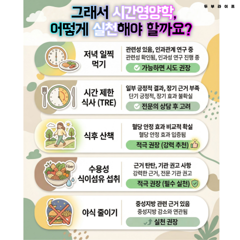 | 저녁 일찍 먹기 | 관련성 있음 (인과관계 연구 중) | 가능하면 시도 | 생체 리듬과의 조화 유도 |