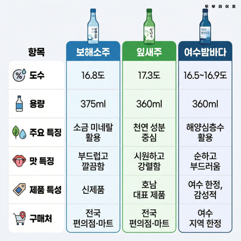 라인업으로는 잎새주, 보해소주, 여수바다 등이 있어요.