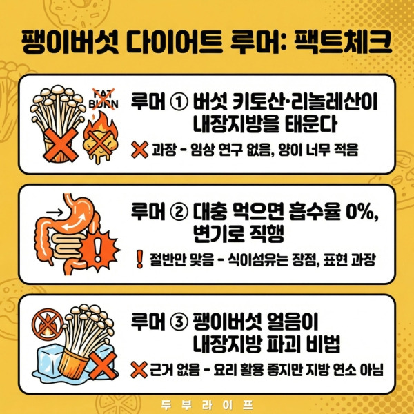 1. 팽이버섯 다이어트, 어디서 시작됐을까요? 2. [팩트체크 ①] "키토산·리놀레산이 내장지방을 태운다" 3. [팩트체크 ②] "대충 먹으면 흡수율 0%, 변기로 직행" 4. [팩트체크 ③] "팽이버섯 얼음이 내장지방 파괴 비법" 5. 그럼 팽이버섯, 진짜 효능은 뭔가요? 6. 팽이버섯 영양 성분 한눈에 보기 7. 총정리 : 팽이버섯, 이렇게 먹어야 진짜 효과 |